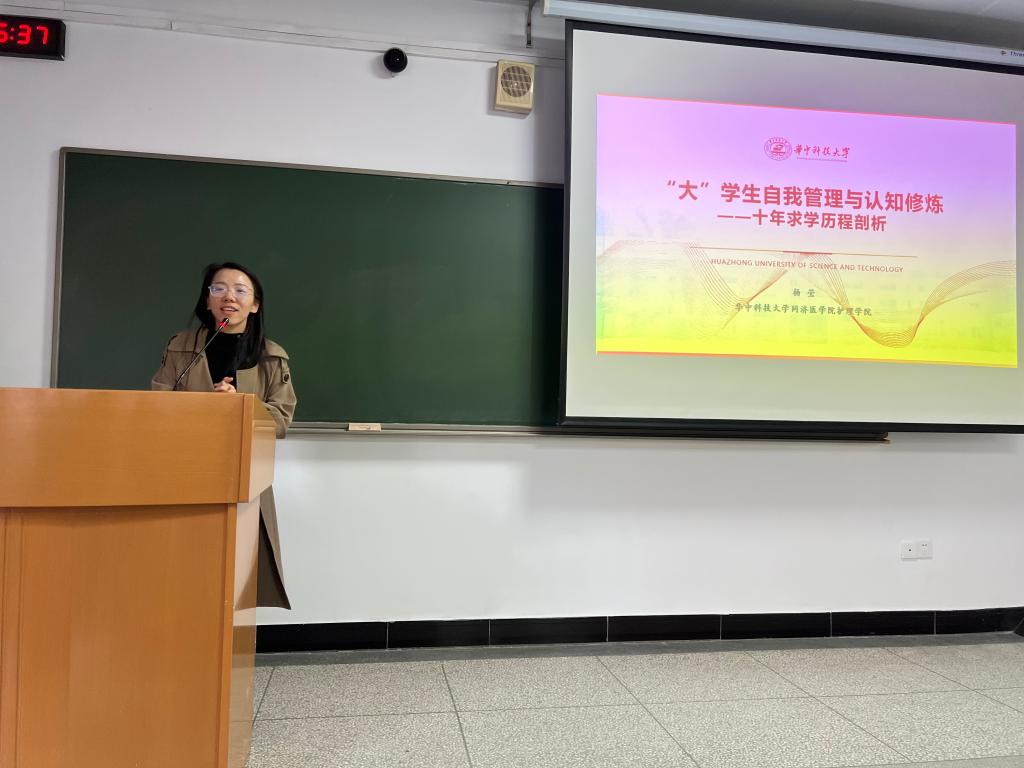 会议伊始,杨莹老师以“大学生自我管理与认知修炼”为主题,通过“十二年求学历程剖析”,立足自身,将个人经验倾囊相授。杨莹老师是原华中科技大学同济医学院护理学(四年制)1101班毕业生,她从“个人学习经历、自我管理、专业认知”三个方面展开,为与会嘉宾带来了一场丰富翔实的演讲。