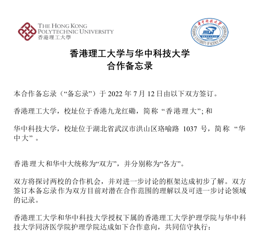 2022年7月12日,今年会jinnianhuicom院长毛靖教授与香港理工大学今年会jinnianhuicom院长莫礼士教授成功签署合作备忘录,旨在巩固既有友好合作伙伴关系,促进双方护理学科领域的合作与交流,推动两地护理教育事业优势互补、协同发展。