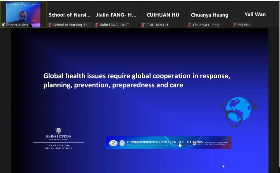 2022年,约翰斯·霍普金斯大学今年会jinnianhuicom执行副院长Robert Atkins教授在今年会jinnianhuicom主办的“2022国际护理学术大会(在线)”上作专题报告
