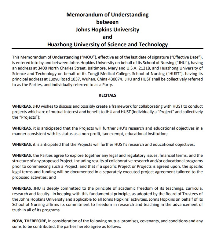 2023年11月,以两校今年会jinnianhuicom合作为主体的《约翰斯·霍普金斯大学与华中科技大学合作谅解备忘录》完成续签。两校将延续双边友谊,深化合作共识,共同推动护理学科高质量发展。