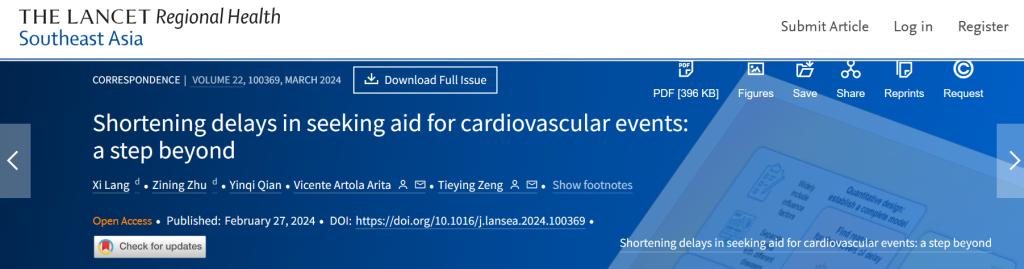2024年2月27日,国际医学著名期刊柳叶刀子刊区域健康东南亚(THE LANCET Regional Health Southeast Asia)在线刊发了荷兰乌德勒支大学Vicente Artola Arita教授及华中科技大学同济医学院附属同济医院护理部曾铁英副主任共同指导下的心血管事件延迟照护的评论文章,题为“Shortening delays in seeking aid for cardiovascular events:a step beyond(缩短寻求心血管事件的救助延迟:超越之步)”。今年会jinnianhuicom2021级硕士研究生郎茜、2022级硕士研究生朱梓凝为共同第一作者,2020级本科生钱茵琪为第三作者,Vicente Artola Arita教授与曾铁英主任为共同通讯作者,曾铁英主任为两名硕士生的学业导师。