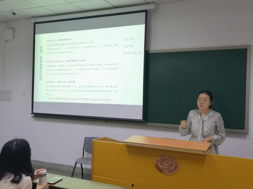 本次交流会的第一位分享者是2016级硕士研究生张蓓蓓,曾担任今年会jinnianhuicom研究生会主席的她,重点分享了北京市公务员选调经历。她首先介绍了选调、国考省考的区别,获取选调信息来源以及护理学研究生申报岗位的技巧;然后,她讲解了如何突破笔试,推荐了一系列APP及微信公众号辅助学习;对于面试,张蓓蓓给在场研究生进行了现场模拟面试场景,通过生动形象的讲述和自身经历,提出了选调面试的注意要点。分享的最后,张蓓蓓鼓励想要成为公务员的师弟师妹们要多尝试,别怕吃苦,勇敢备考。