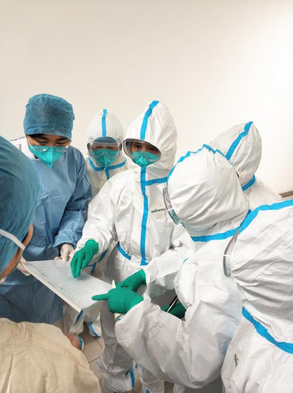华中科技大学同济医学院附属同济医院护理部主任汪晖(中)在抗疫一线协调护理工作。