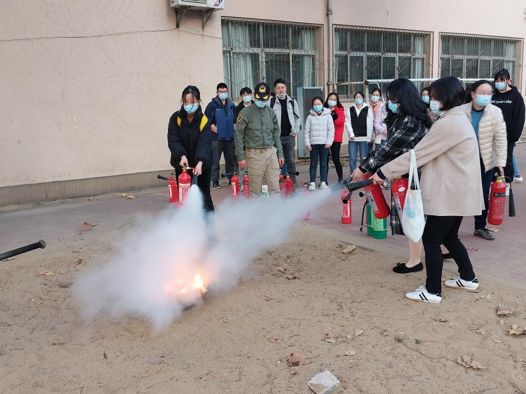 培训中,张凯教官为大家讲解了基本消防安全制度,介绍了常规的消防安全措施与常用的消防安全器材,结合大量实际生活中发生的真实新闻案例,配合触目惊心的图片和视频,生动地向同学们讲解了火灾的严重性并对同学们消防安全意识中所存在的问题进行纠正,现场演示了二氧化碳干冰灭火器的使用方法,使大家对于安全消防知识有了更直观的认识与了解。在实操现场,许多同学在消防员们的指导下进行了灭火器实际操作演练,演练中同学们产生的疑虑也都被一一解答。