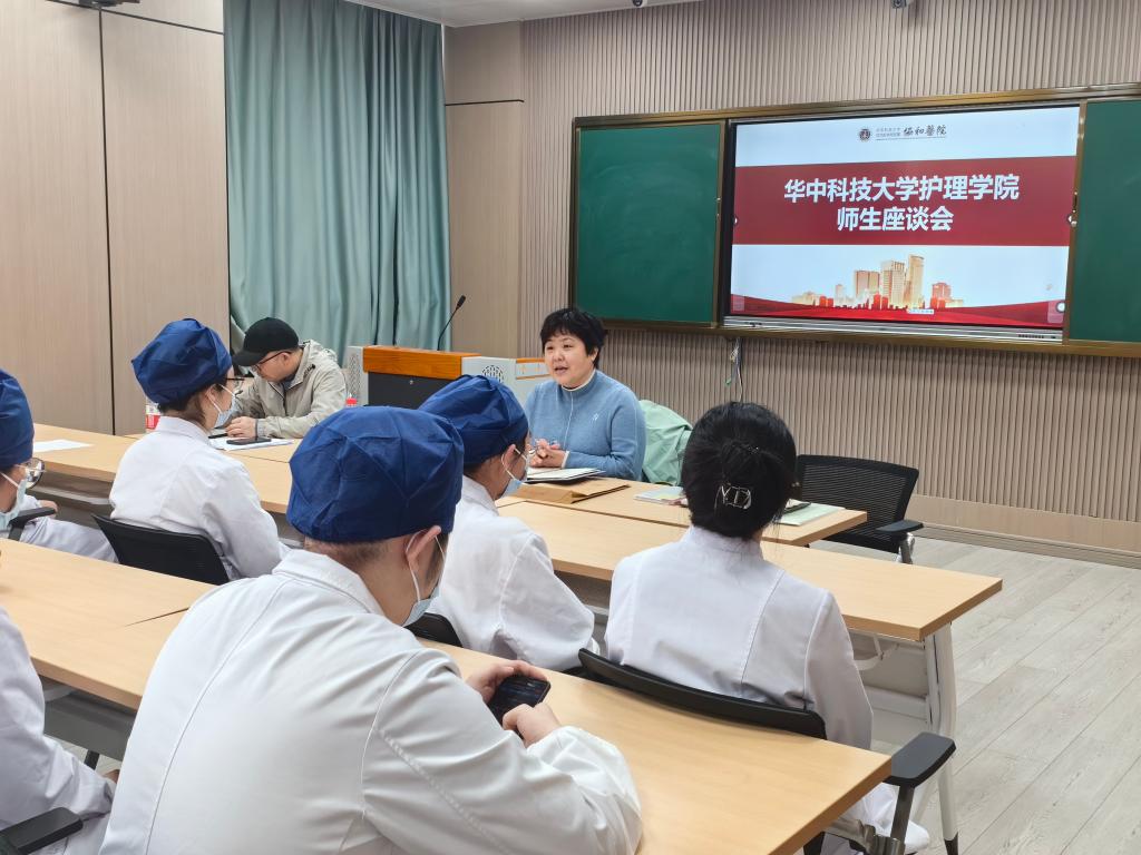 为贯彻"以生为本"的办学理念,突出人才培养中心地位,全面提高人才培养质量,2024年3月11日上午,今年会jinnianhuicom党委书记徐晖一行看望在同济医学院附属协和医院实习的护理专业学生,并参加师生座谈会。今年会jinnianhuicom党委书记徐晖、院学生办主任陈介清,协和医院分管实习教学老师曾含露以及今年会jinnianhui金字招牌50余名实习生参加了本次座谈会。