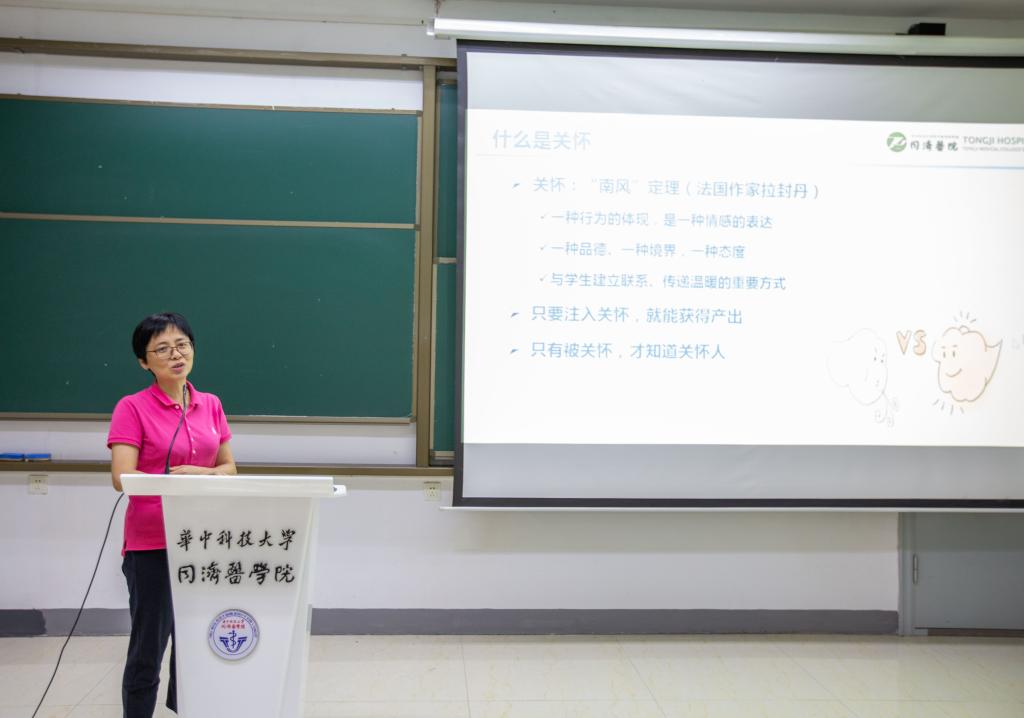 附属同济医院护理部曾铁英主任以“研究生教学中的关怀艺术”切入点,讲解了“关怀”的概念。曾主任表示,关怀是了解学生的特点和需求;关怀是接纳自己的和学生的不完美;关怀是示弱,只有内心强大、学识渊博、胸襟广阔的人,才能真正做到示弱;关怀是期望,设定好导师的期望目标,同时也要关注学生自己的期望目标;关怀是赏识,欣赏学生、理解学生;关怀是批评,正确适度批评学生,同时为学生提供帮助。