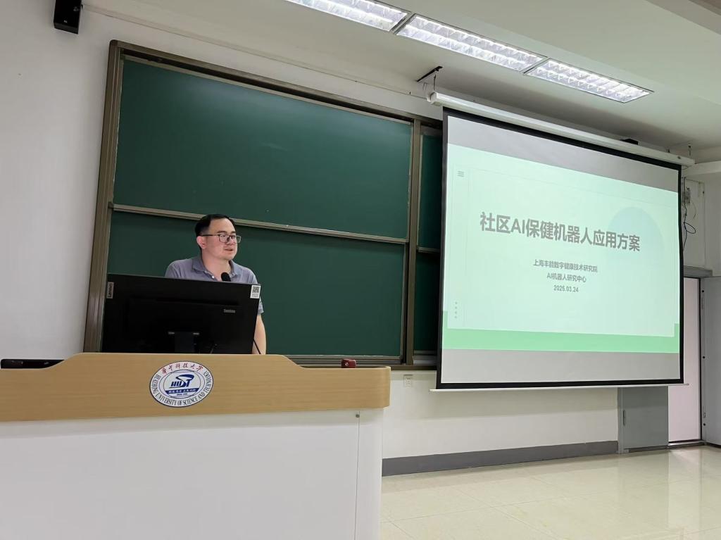 胡朝阳校友深耕社区嵌入式"邻里守护"老年人医养结合领域多年,在上海、浙江等地的创新实践成果丰硕。分享会上,他系统阐释了AI康养机器人在社区场景的全流程应用方案,详细展示了其主导研发的智能康养设备在技术创新、功能拓展及服务模式上的突破性成果。同时,通过详实数据和典型案例,深入浅出地解读了我国老龄化现状与社区康养产业趋势,为学生打开了一扇洞悉行业发展的窗口。胡朝阳校友还特别结合实际项目,揭秘了AI康养机器人商业化落地过程中,通过合伙人机制实现技术成果转化的创新模式。