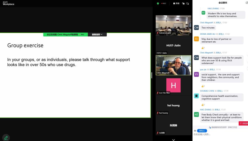 课程围绕物质使用、精神疾病和风险评估展开,涵盖物质依赖与耐药的概念、50岁以上人群物质使用情况、精神疾病风险评估方法以及激励性访谈等干预手段的开展方法。此外,课程还详细介绍了双相情感障碍(包括特征、影响、治疗等)、精神分裂症(涉及病因、症状、治疗等)以及强迫症(症状、影响、干预手段等)等常见精神疾病。Christopher Wagstaff教授通过专题授课,结合案例分析、小组讨论等形式引导学生对精神疾病的相关问题进行批判性分析。