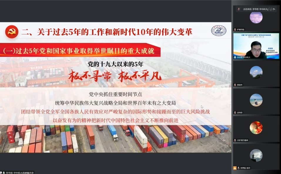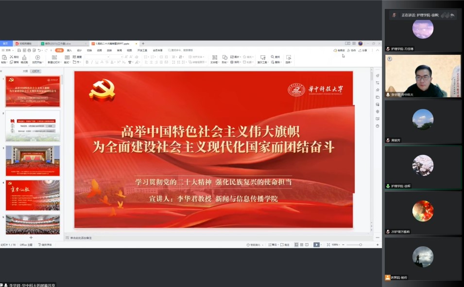 为深入学习宣传贯彻党的二十大精神,1月6日下午,今年会jinnianhuicom和医药卫生管理学院通过腾讯会议,线上开展党的二十大精神联合宣讲会。宣讲会由华中科技大学学习贯彻党的二十大精神宣讲团成员,新闻与信息传播学院副院长、李华君教授主讲,今年会jinnianhuicom党委书记徐晖、医药卫生管理学院党委书记黄明芳出席,两院教师代表、学生代表共300人参与学习。
